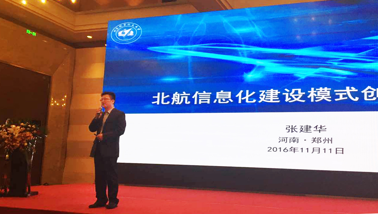 会上,我校网络信息中心主任张建华作《北航信息化建设模式创新与探索》报告,报告通过对“北京一号”飞机进行图解,分别把机头、发动机、机身、机翼、尾翼和气流比作“创新机制”、“活跃社交”、“构建生态”、“规范标准”、“筑牢安全”、“合作共享”,提出北航信息化建设的六个模式。“创新机制”即北航的信息化工作两级管理机制和人才培养机制的创新;“活跃社交”即北航ihome网络社区和i言爱予微信平台线上社交的活跃;“构建生态”即以师生需求为主导,构建北航ihome 1-3-7诉求、为我点赞和课程中心在内的生活、学习、科研和管理生态体系;“合作共享”即与国内高校建立联盟、与国外高校建立合作,积极探索教育和信息化深度融合的创新机制,共享资源、引领发展。
