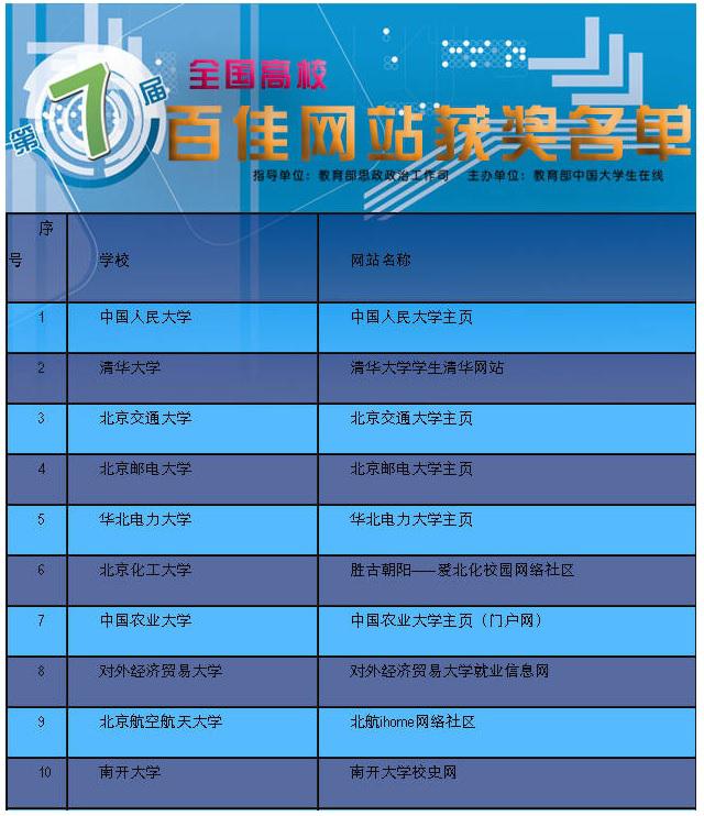 第七届网络评选自2014年7月启动以来,清华大学、中国人民大学等各校积极参与,共有29个省市区的395所高校申报参评,参与高校达到历史新高。我校ihome社区等100个高校网站经网络投票、省市初评、专家终评和公示等多个环节,从内容组织、技术建设、对学生吸引力、传播效果等多方面评比,最终收获高校百佳网站称号与奖牌。