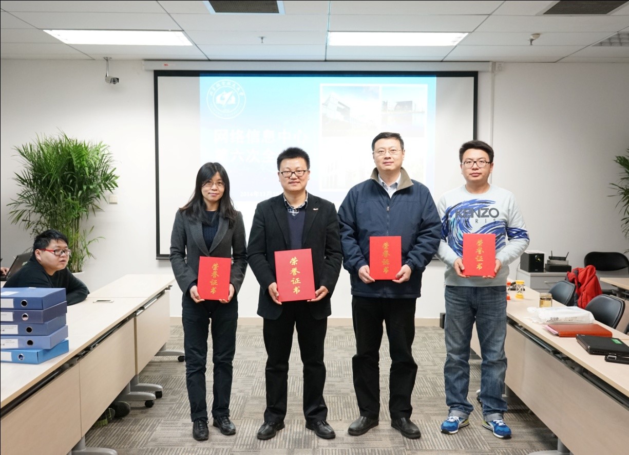 11月28日网络信息中心全体工作人员在G221召开中心第六次全体会议,会议由网络信息中心主任张建华主持。会上张建华主任分享了中国教育和科研计算机网CERNET第二十一届学术年会暨CERNET建设二十周年纪念大会的心得,并祝贺网络信息中心三名工作人员获得了CERNET建设二十周年纪念大会十年突出贡献奖。他还与大家一起分享近期感悟,提出”的工作方式,倡导用积极的心态面对工作。随后,部分工作人员对APEC假期间的调研工作进行了总结汇报。仲万江老师对长春地区高校无线网络进行用户调研,汇报了长春之行的感想。王延吉老师浅析了自己对教育的认识。许兴老师阐述了对工作态度、方法的领悟和陈劳老师围绕“我是谁?我从哪里来?我的目标是什么?(简称WWW)”谈了自己的理解,提出对“无中生有”一词新的感悟。张楠老师分享了广西调研中的体会。