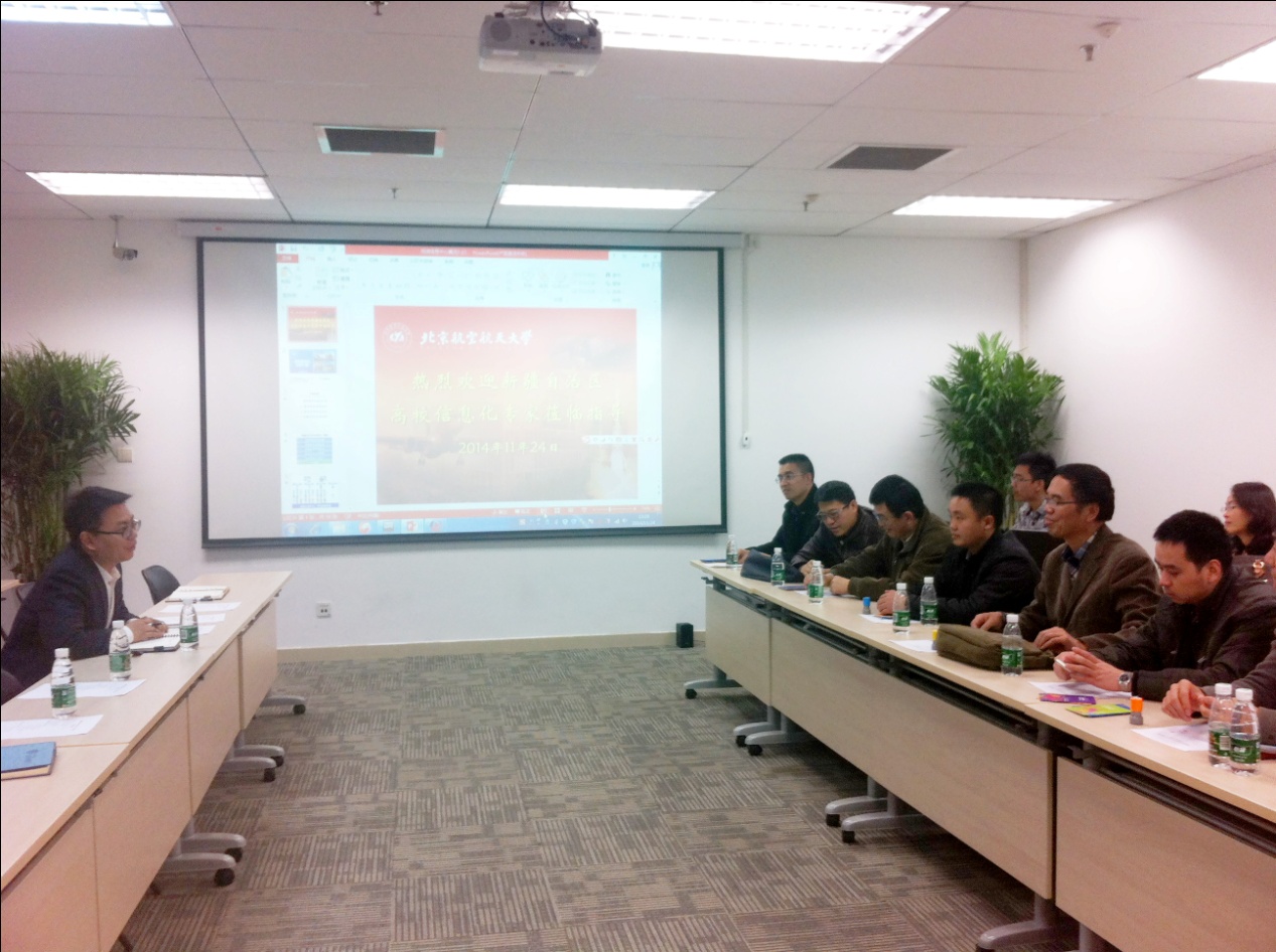 新疆维吾尔自治区信息化专家参观了我校的核心机房,与网络信息中心工作人员一同观看北航信息化专题片《智慧北航》。网络信息中心办公室主任张楠介绍了我校网络基础设施建设、移动应用建设、信息化系统建设现状和目标、流程中心和“三个体系”建设等工作的总体情况。网络信息中心相关工作人员通过实践操作重点介绍了我校虚拟数据中心的智慧化应用、ihome互动社区的应用服务和网络课程中心的建设。随后赶来参会的网络信息中心主任张建华结合互联网信息化的性质阐述了信息化建设的人员工作分配情况、互联网思维方式的培养和信息化工作的核心问题。