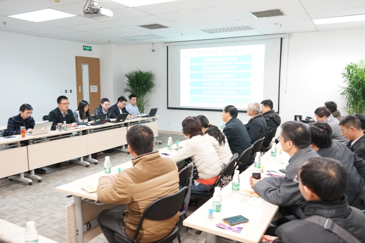 首先,网络信息化中心工作人员对各位专家的到来表示热烈欢迎,带领福建省信息化专家一行参观了学校核心机房,观看信息化专题片《智慧北航》。张建华主任结合自身经历的案例深入浅出做了对信息化建设的理解,随后对校园网络建设过程、网络信息管理发布、网络管理制度的制定一一作了介绍,并重点介绍了IT治理情况。